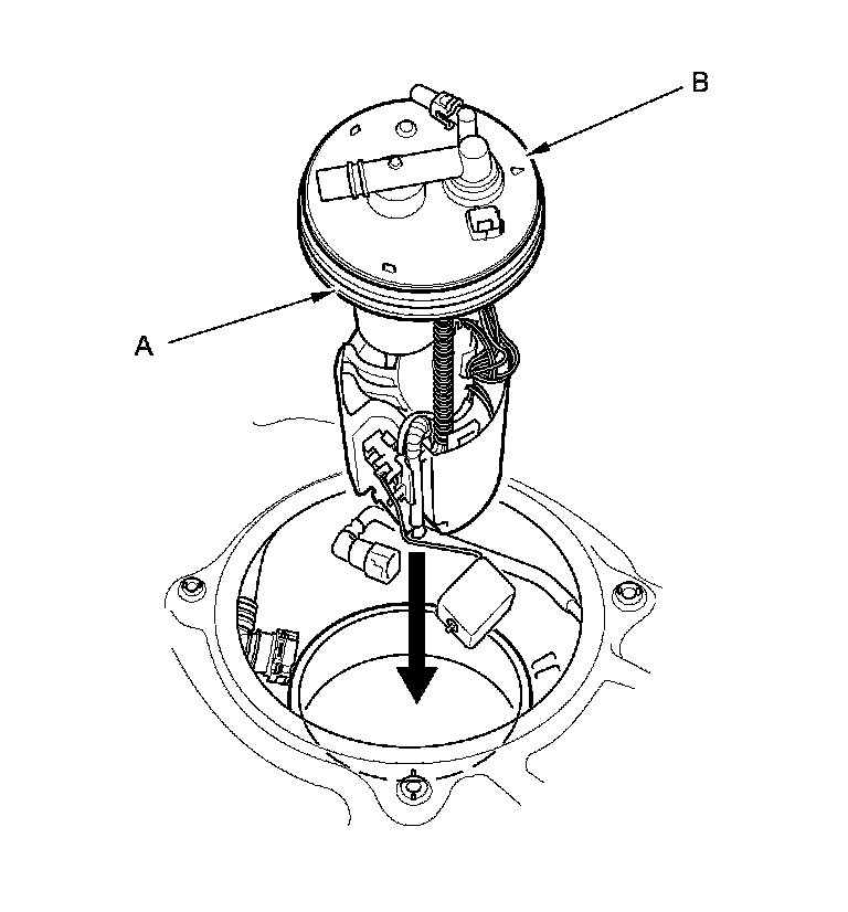 1. Temporarily attach a new base gasket (A) to the fuel tank unit (B), then insert the fuel tank unit partially into the fuel tank.