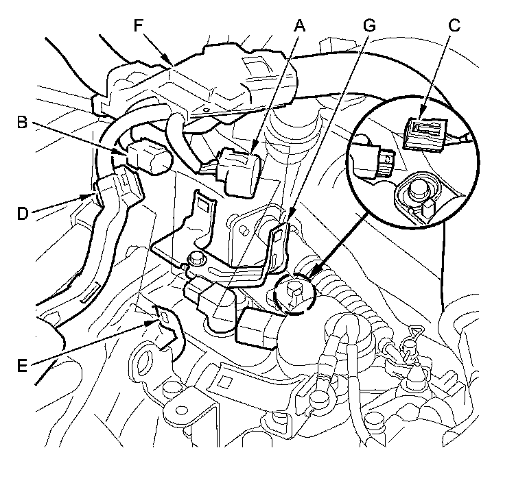 15. Connect the transmission range switch 8P connector (E), the CVT output shaft (driven pulley) speed sensor 3P connector (F), and the vehicle speed sensor 3P connector (G).
