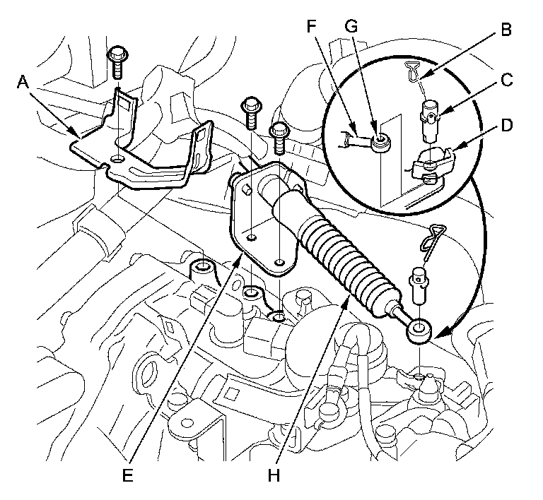 7. Remove the bolts securing the shift cable holder (E), then separate the shift cable end (F) from the selector control lever. Check the shift cable end collar (G) for wear or damage, and replace the shift cable (H) Service and Repair if necessary.