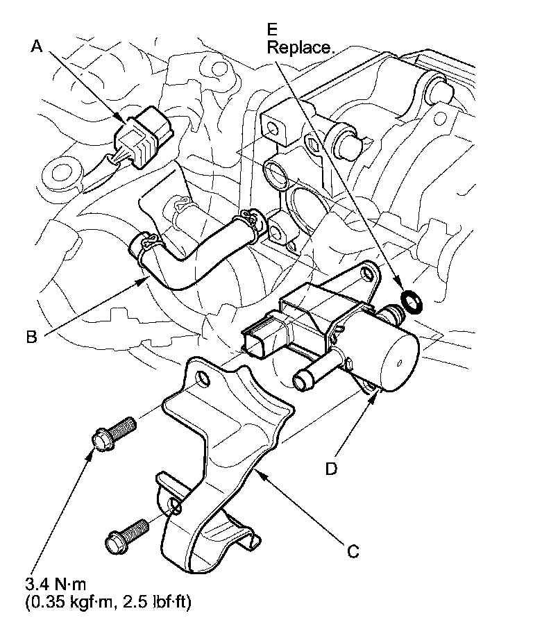 3. Install the parts in the reverse order of removal with a new O-ring (E).