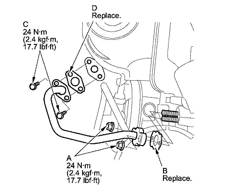 2. Install the EGR pipe to the TWC side, tighten the bolts (C) by hand with a new gasket (D), then torque the bolts.