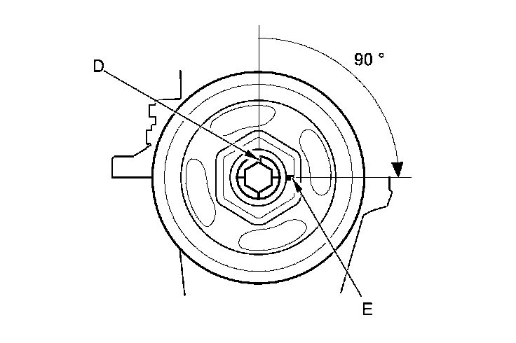 Mark the bolt head (D) and the crankshaft pulley (E) as shown, then tighten the bolt an additional 90 ° (the mark on the bolt head lines up with the mark on the crankshaft pulley).