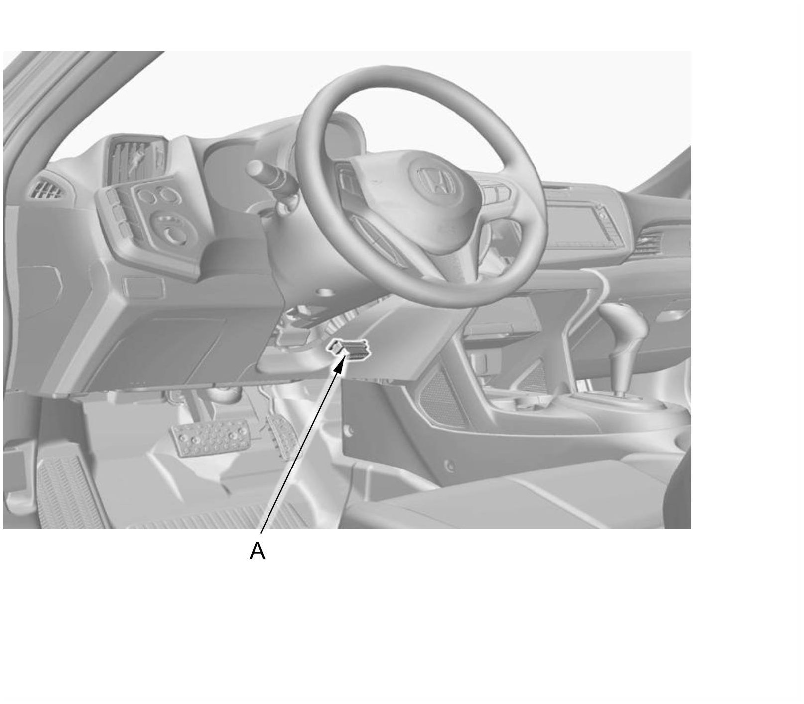 1. With the ignition switch in LOCK (0), connect the HDS to the data link connector (DLC) (A) located under the driver's side of the dashboard.