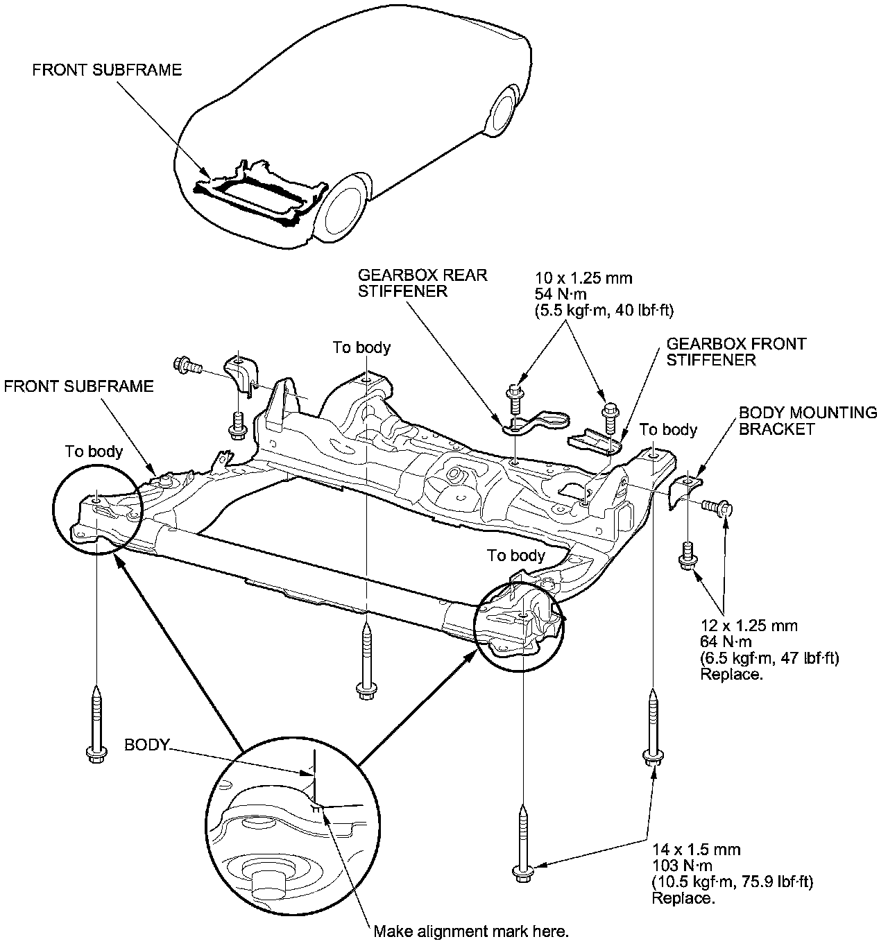 - After mounting the subframe and brackets loosely, align the reference marks with the body, then tighten the bolts.