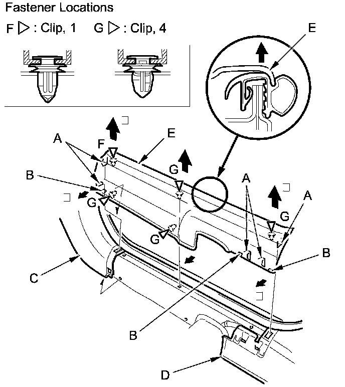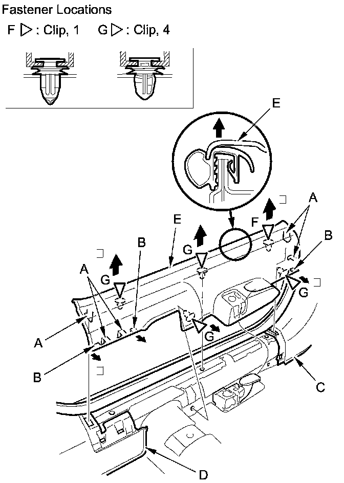 2. Pull back the kick panel by hand to detach the clips (D, E).