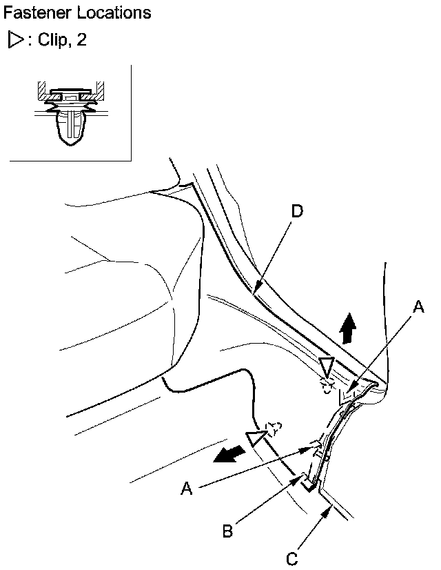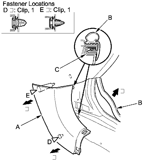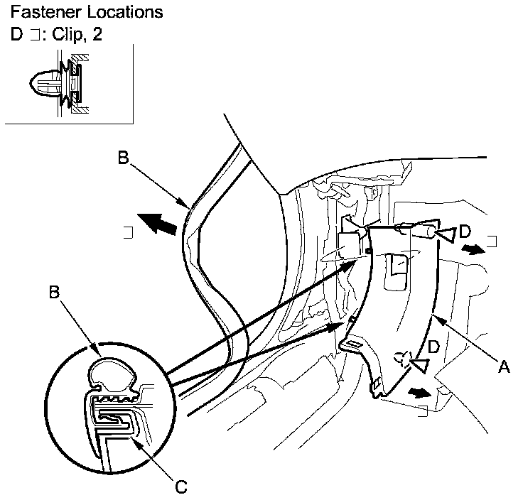1. Pull out the front door opening seal (B) as needed from the kick panel hooks (C).