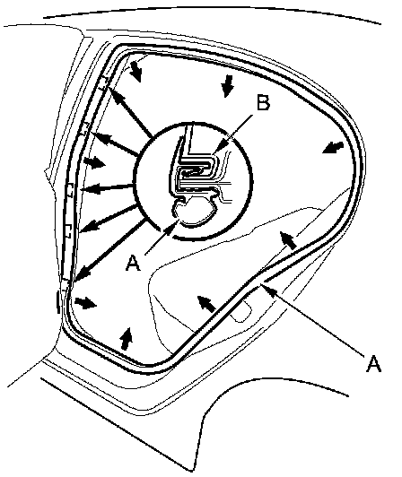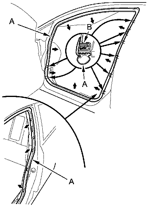 3. Pull out the rear door opening seal (A) from the trim hooks (B) around the rear door opening flange, then remove the seal.
