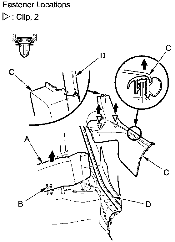 1. Release the hooks (A) and the tab (B) from the B-pillar lower trim (C). Pull up the rear door sill trim (D) by hand to detach the clips.