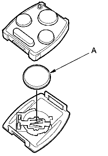 4. Replace the transmitter battery (A) with a new one (CR1616), and try to lock and unlock the doors with the transmitter by pressing the lock or unlock button five or six times.