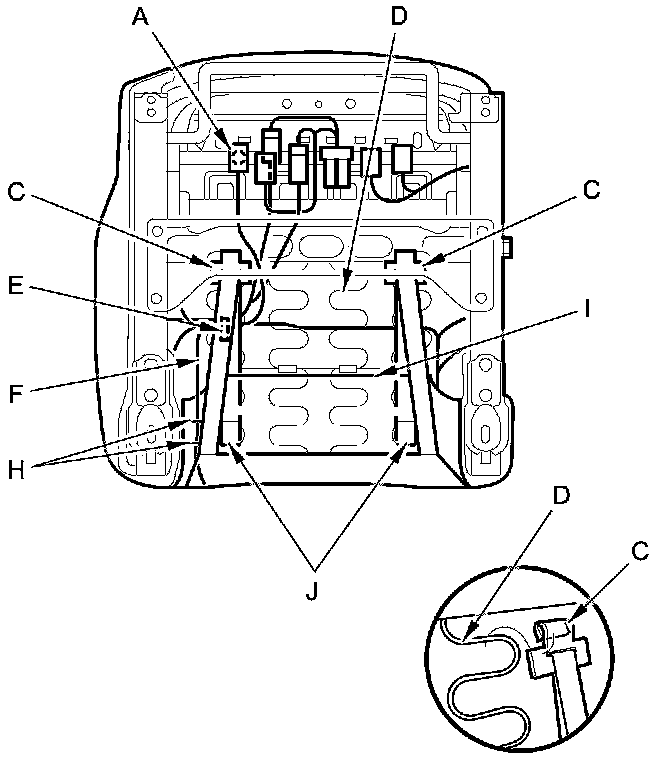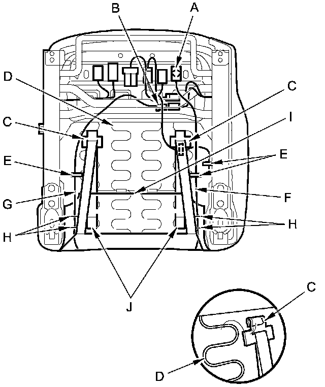 4. Release the hooks (C) from the seat cushion frame spring (D). Remove the wire tie(s) (E) and pull out the side airbag harness (F) and seat-back heater harness (G) (driver's seat) through slits (H) in the seat cushion cover (I). Turn over the seat cushion cover, and release the hooks (J).