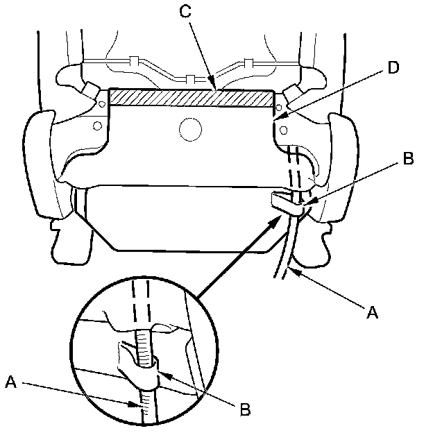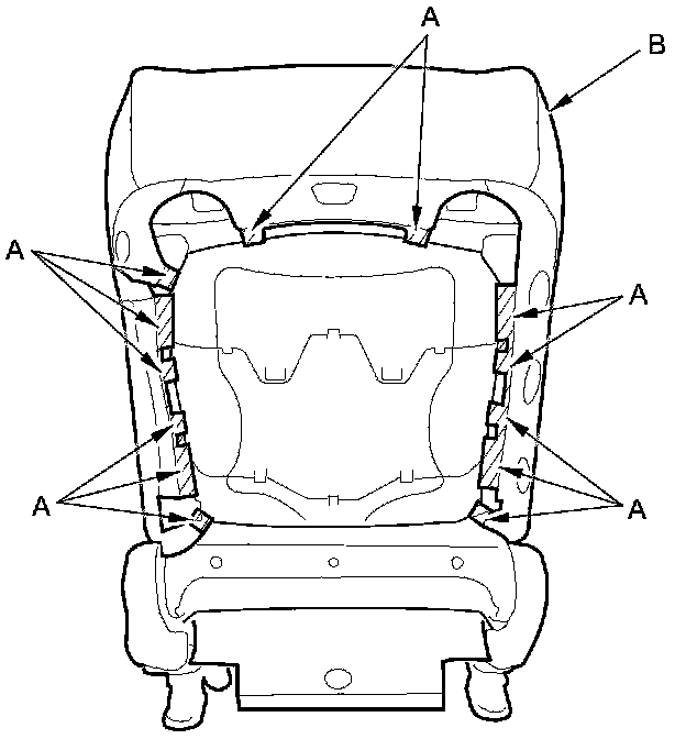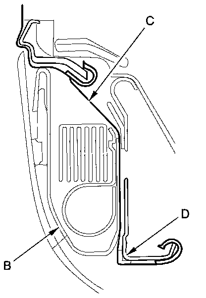 - Before installing the side airbag (B), make sure the reinforcing cloth (C) is fixed on the seat-back frame (D) securely.