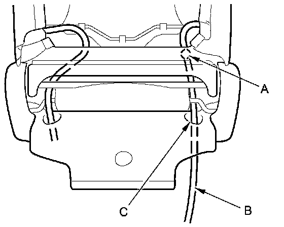 9. Detach the harness clip (A), and pull out the side airbag harness (B) through the harness hole (C) in the seat-back cover and the seat frame. Passenger's seat is shown; driver's seat is similar.