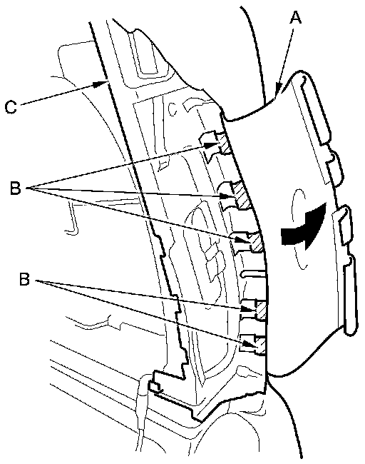 12. Turn over the reinforcing cloth (A), then release the hook strips (B) from the side airbag module holder (C).