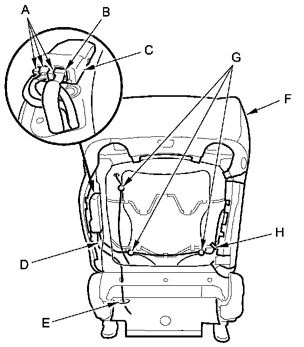 13. Passenger's seat: Disconnect the OPDS sensor connectors (A) and the ODS unit connector (B) from the ODS unit (C), and pull them in through the hole in the seat frame. Pull out the ODS unit subharness (D) through the harness hole (E) in the seat-back cover (F). Detach the harness clips (G), and remove the wire tie (H).