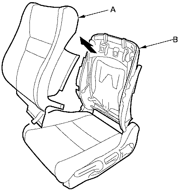 15. Remove the seat-back cover/pad (A) from the seat-back frame (B).