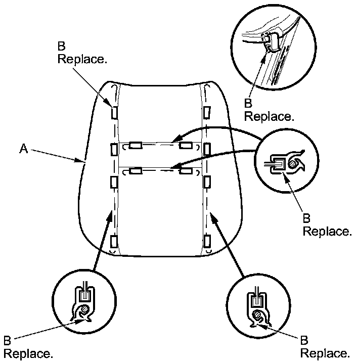 16. Pull back the edge of the seat-back cover (A) all the way around, and release the clips (B), then remove the cover.