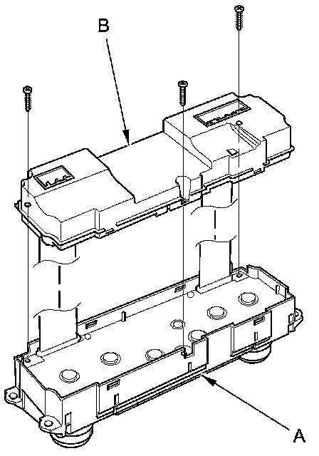 3. Remove the self-tapping screws, then carefully separate the climate control unit display (A) from the control unit (B). Do not kink or pull on the wires between the display and the control panel. Do not touch the electronic components on the printed circuit board in the control panel.