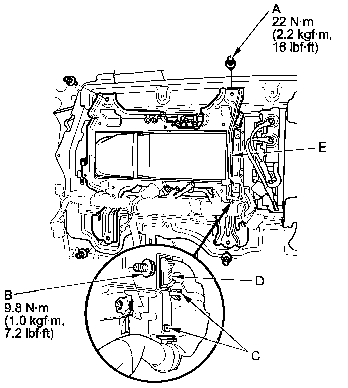 11. Remove the bolt (B) and the clamps (C), then disconnect the MCM connector (D).