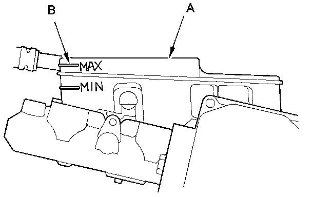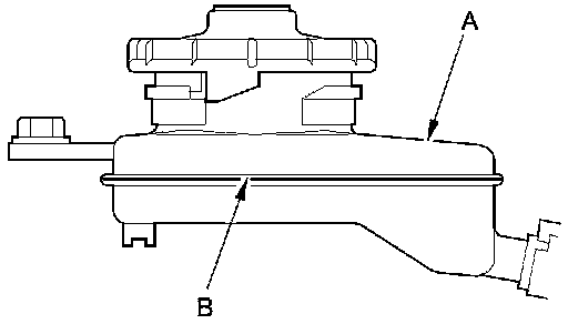 5. Check that the brake fluid level in the subreservoir is at the MAX (upper) level line (B).