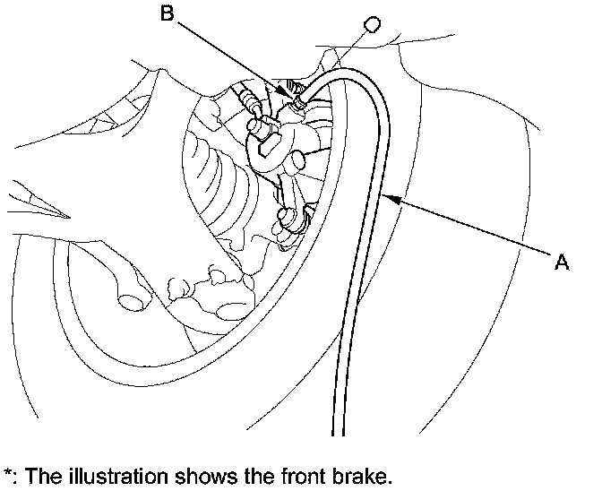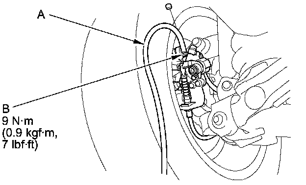 3. Attach a length of drain tube (A) to the bleed screw (B) on the caliper or wheel cylinder.