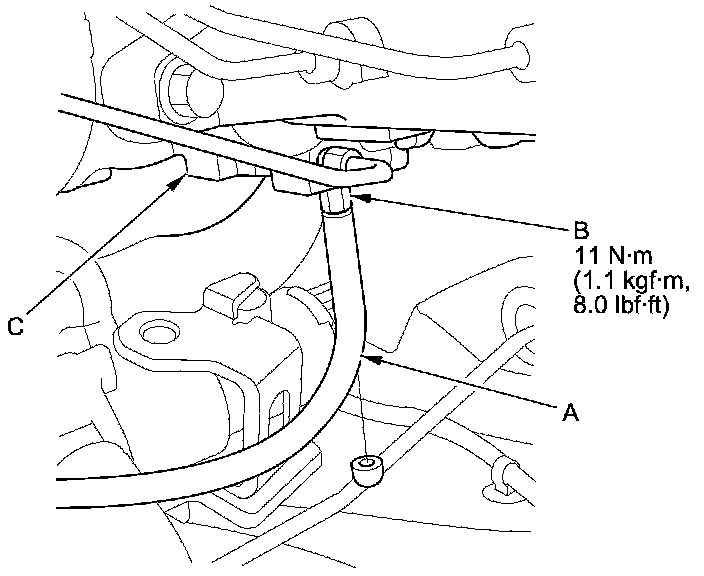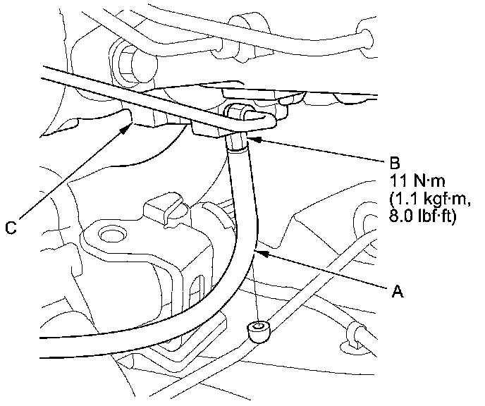 8. Attach a length of clear drain tube (A) to the bleed screw (B) under the servo unit (C), and loosen the bleed screw.