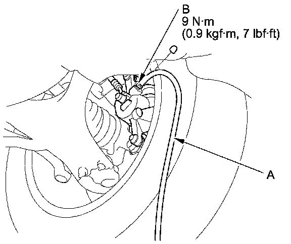 6. Attach a length of clear drain tube (A) to the bleed screw (B), then loosen the bleed screw to allow air to escape from the system. Then tighten the bleed screw securely.