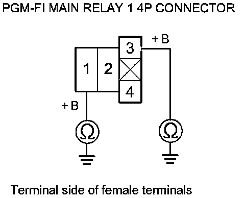 48. Check for continuity between PGM-FI main relay 1 4P connector terminal No. 2 and body ground.