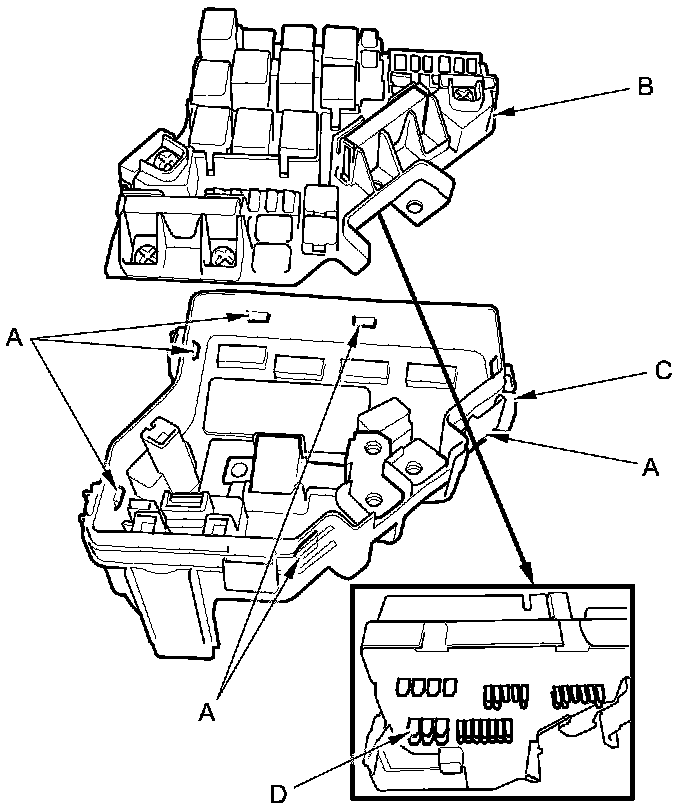 5. Turn the housing over again. Using two flat-tip screwdrivers, release the tabs (A), and pry up the fuse/relay box base (B) from the fuse/relay box housing (C).