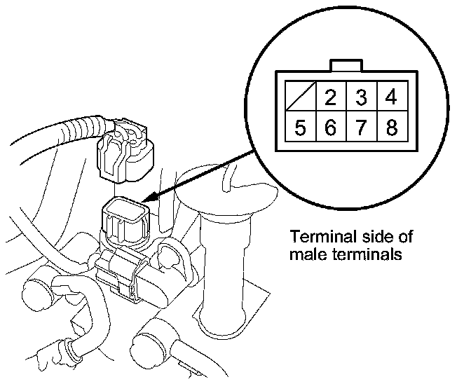5. Connect a jumper wire from the battery positive terminal to solenoid harness connector terminal No. 4, and connect another jumper wire from the battery negative terminal to terminal No. 8. A clicking sound should be heard.