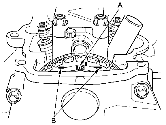 2. Set the No. 1 piston at top dead center (TDC). The "UP" mark (A) on the camshaft sprocket should be at the top, and the TDC grooves (B) on the camshaft sprocket should line up with the top edge of the head.