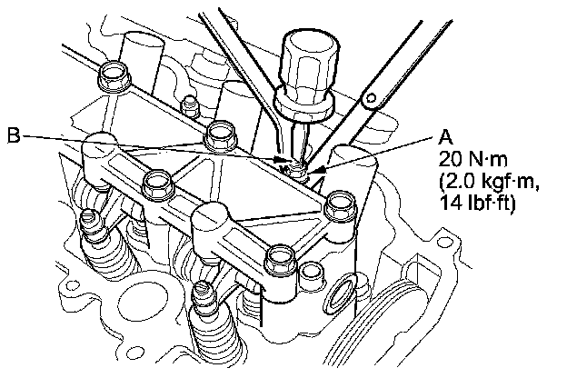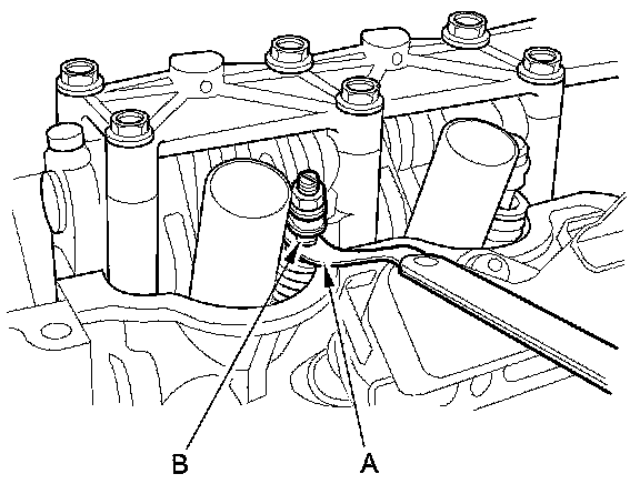 4. Insert the feeler gauge (A) between the adjusting screw (B) and the end of the valve stem on the No. 1 cylinder and slide it back and forth; you should feel a slight amount of drag.