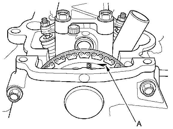 7. Rotate the crankshaft clockwise. Align the No. 3 piston TDC groove (A) on the camshaft sprocket with the top edge of the head.