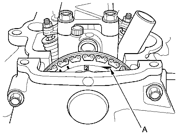11. Rotate the crankshaft clockwise. Align the No. 2 piston TDC groove (A) on the camshaft sprocket with the top edge of the head.