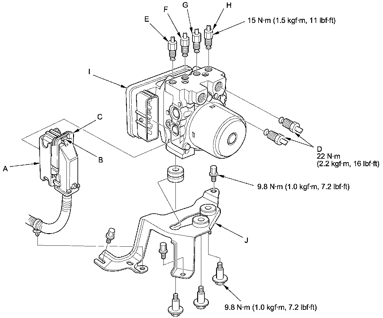 4. Remove the VSA modulator-control unit (I) with the bracket (J) from the body.