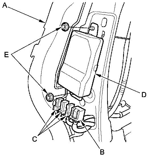 1. Place the ODS unit (A) on the seat-back frame. Tighten the two nuts (B), and connect the ODS unit 18P connector (C) and OPDS sensor connectors (D) to the ODS unit.