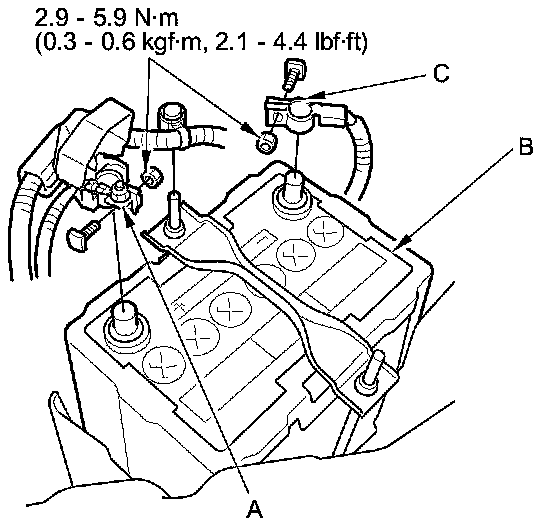 3. Reconnect the positive cable (A) to the battery (B) first, then reconnect the negative cable (C) to the battery.