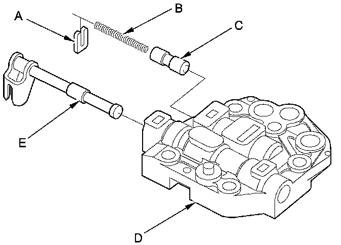 1. Remove the spring seat (A), the valve spring (B), and the reverse inhibitor valve (C) from the manual valve body (D).