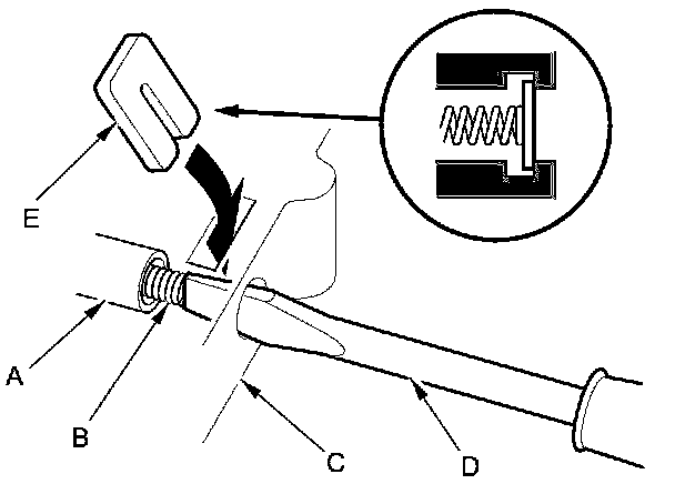 6. Install the reverse inhibitor valve (A) and the valve spring (B) in the manual valve body (C). Push the valve spring in using a screwdriver (D), then install the spring seat (E).