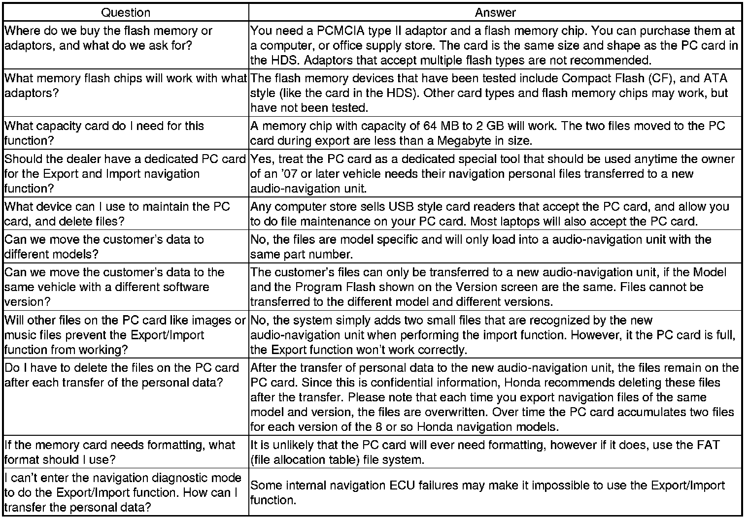 When replacing the audio-navigation unit, this function allows the dealer to transfer the customer's personal data to the new audio-navigation unit. The transferred information includes their Setup settings, and personal addresses. The dealer inserts a PC card to the audio-navigation unit, and then selects the Save Users Memory function. The two functions in this diagnostic screen are EXPORT and IMPORT. EXPORT saves the customer's data to the PC card, and IMPORT moves the PC card files to the new audio-navigation unit.