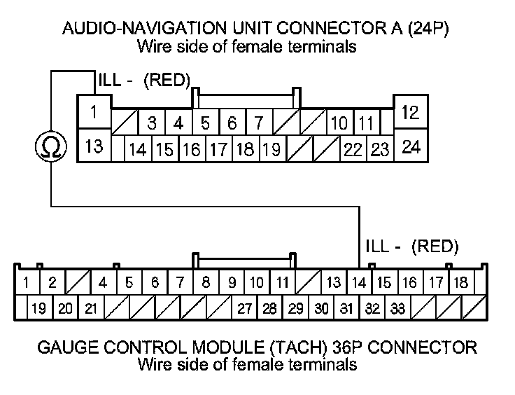 8. Check for continuity between audio-navigation unit connector A (24P) terminal No. 1 and gauge control module (tach) 36P connector terminal No. 14.