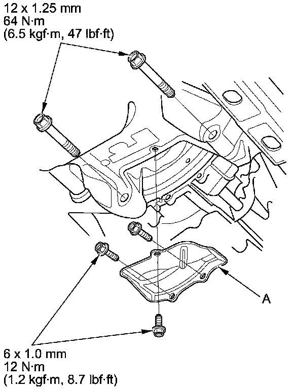 6. Install the torque converter case cover (A), and install the two bolts securing the transmission.