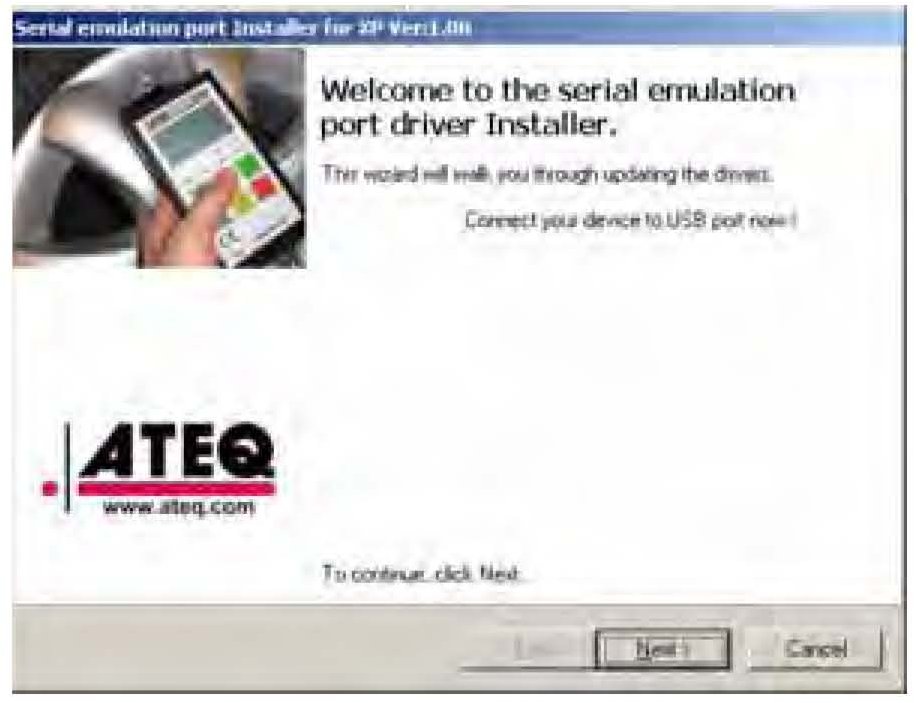 12. The serial emulation port driver installer screen appears. Connect your VT55, and turn it on. Select Next.