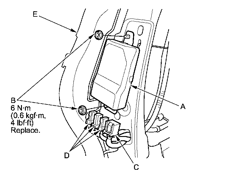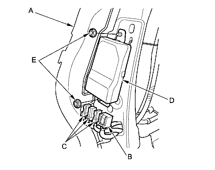 1. Place the ODS unit (A) on the seat-back frame. Tighten the two nuts (B), and connect the ODS unit 18P connector (C) and OPDS sensor connectors (D) to the ODS unit.