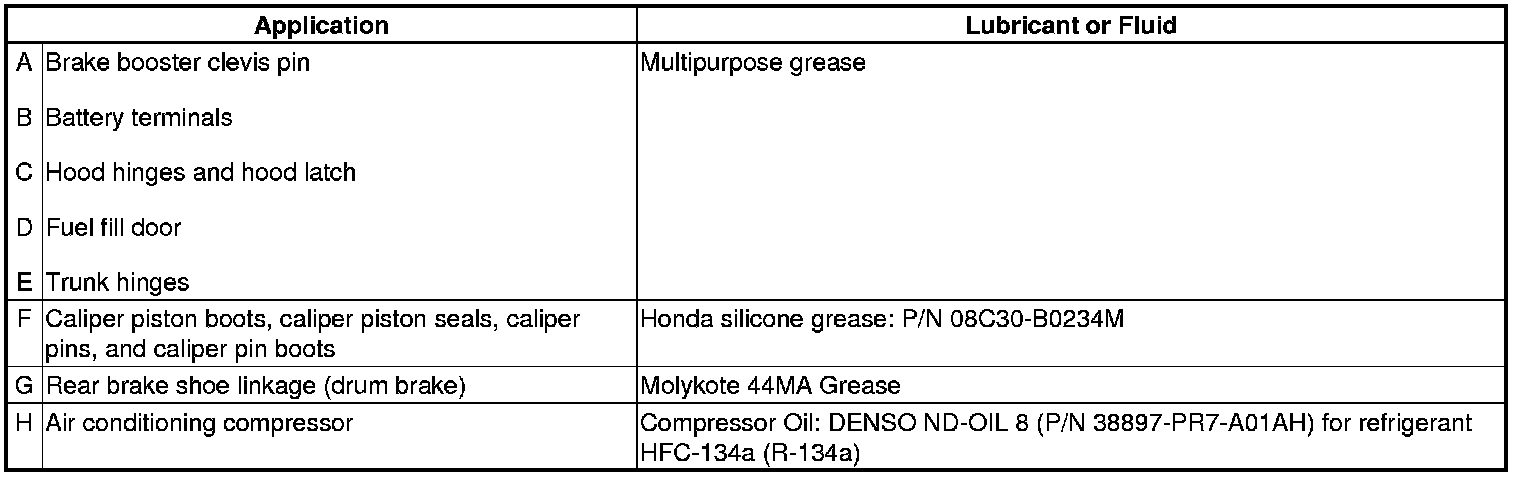 - Lubricate the following areas using the recommended lubricants and fluids.
