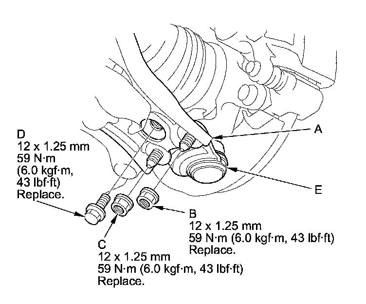 6. Disconnect the lower ball joint (E) from the lower arm.