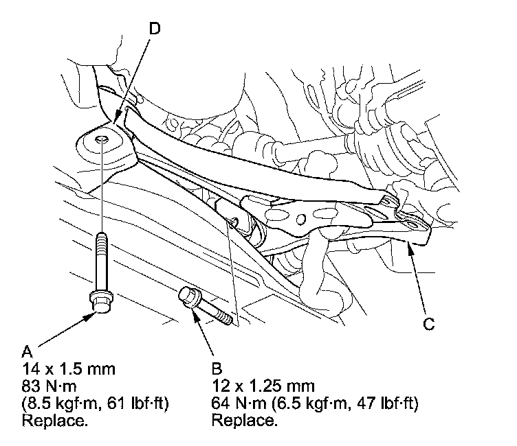 NOTE: During installation, install the new flange bolt and the new self-locking nuts. After lightly tightening all three fasteners, tighten them to the specified torque in the following order; the nut on the front (B), the nut on the rear (C), then the bolt (D).