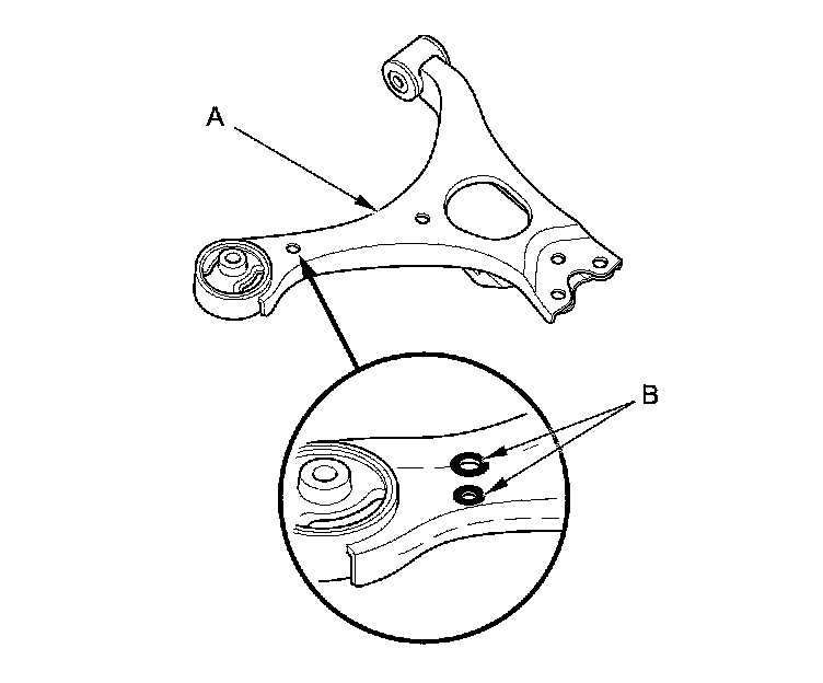NOTE: Replace the lower arm (A) as an assembly if the lower arm has the paint mark (B) around the hole near the front bushing. The paint mark can also be seen around a hole on the bottom side of the lower arm in the same area. Paint marks indicate a oversize bushing has been installed.
