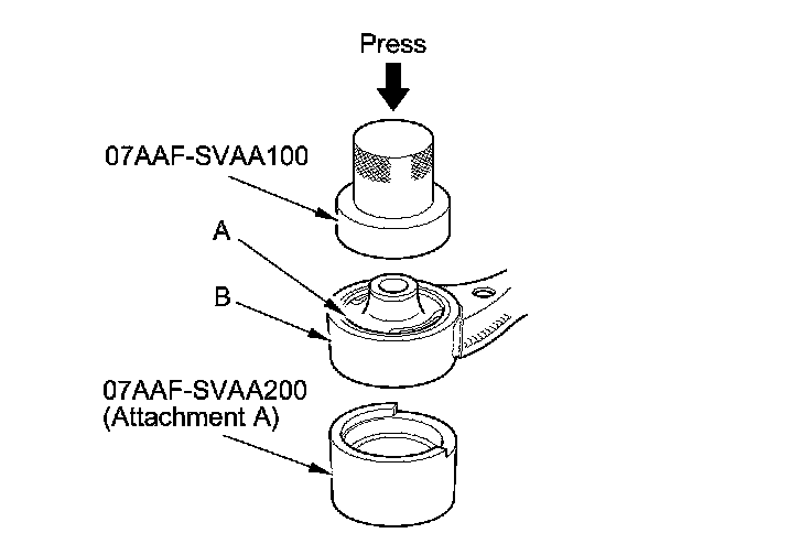 1. Press out the bushing (A) with the bushing driver, receiver set (attachment A), and a hydraulic press, and remove the bushing from the lower arm (B).