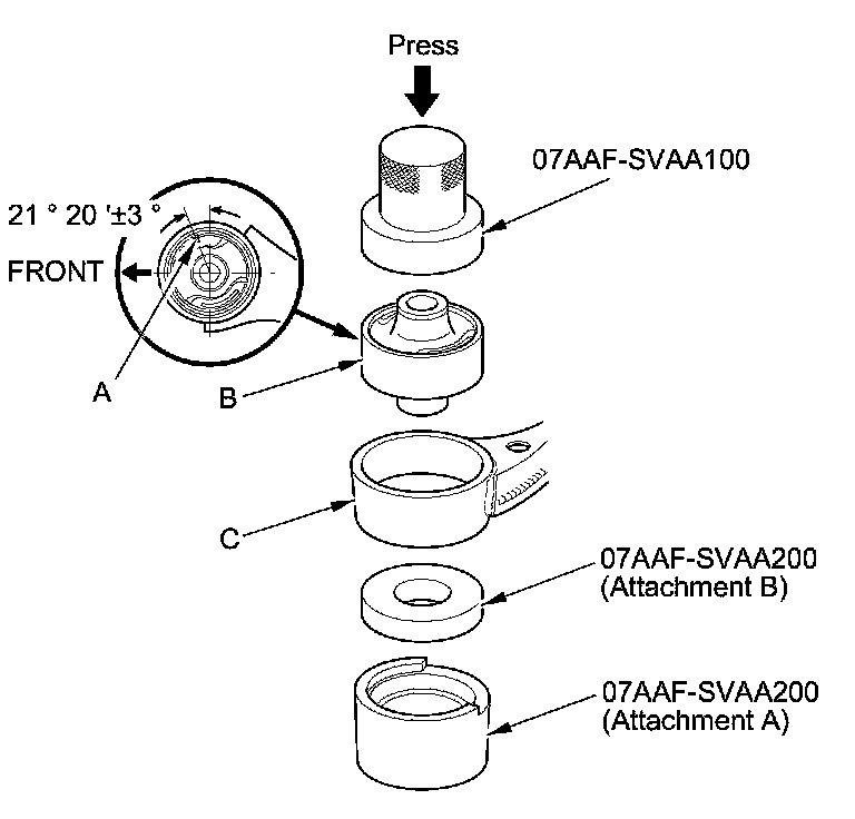 3. Position the tab (A) of the bushing (B) with the lower arm (C) as shown.
