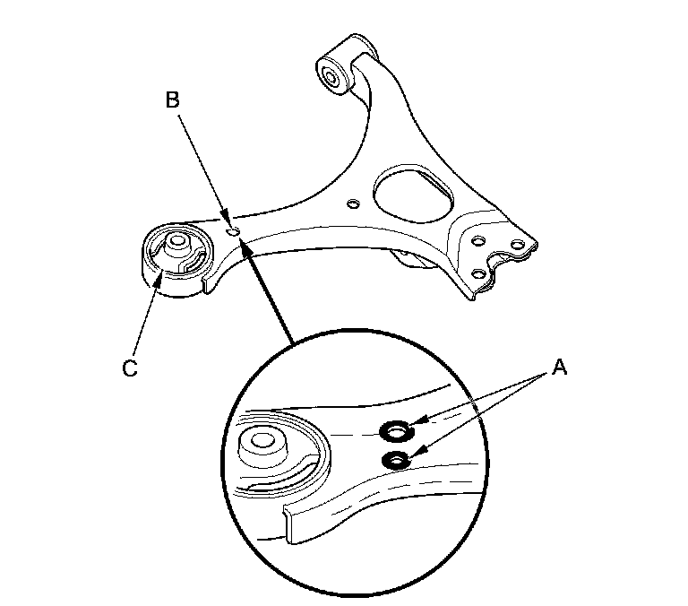 5. Using a yellow oil-based paint marker, paint a mark (A) around the hole (B) near the front bushing (C). Also paint a mark around the hole on the bottom side of the lower arm in the same area.